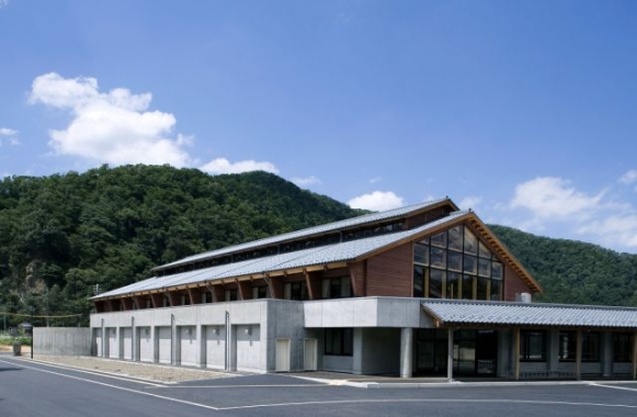 住所: 南条郡南越前町 用途:体育館 延床面積:1369.09m2 材料(樹種):集成材(米松)・集成材(杉)地場産