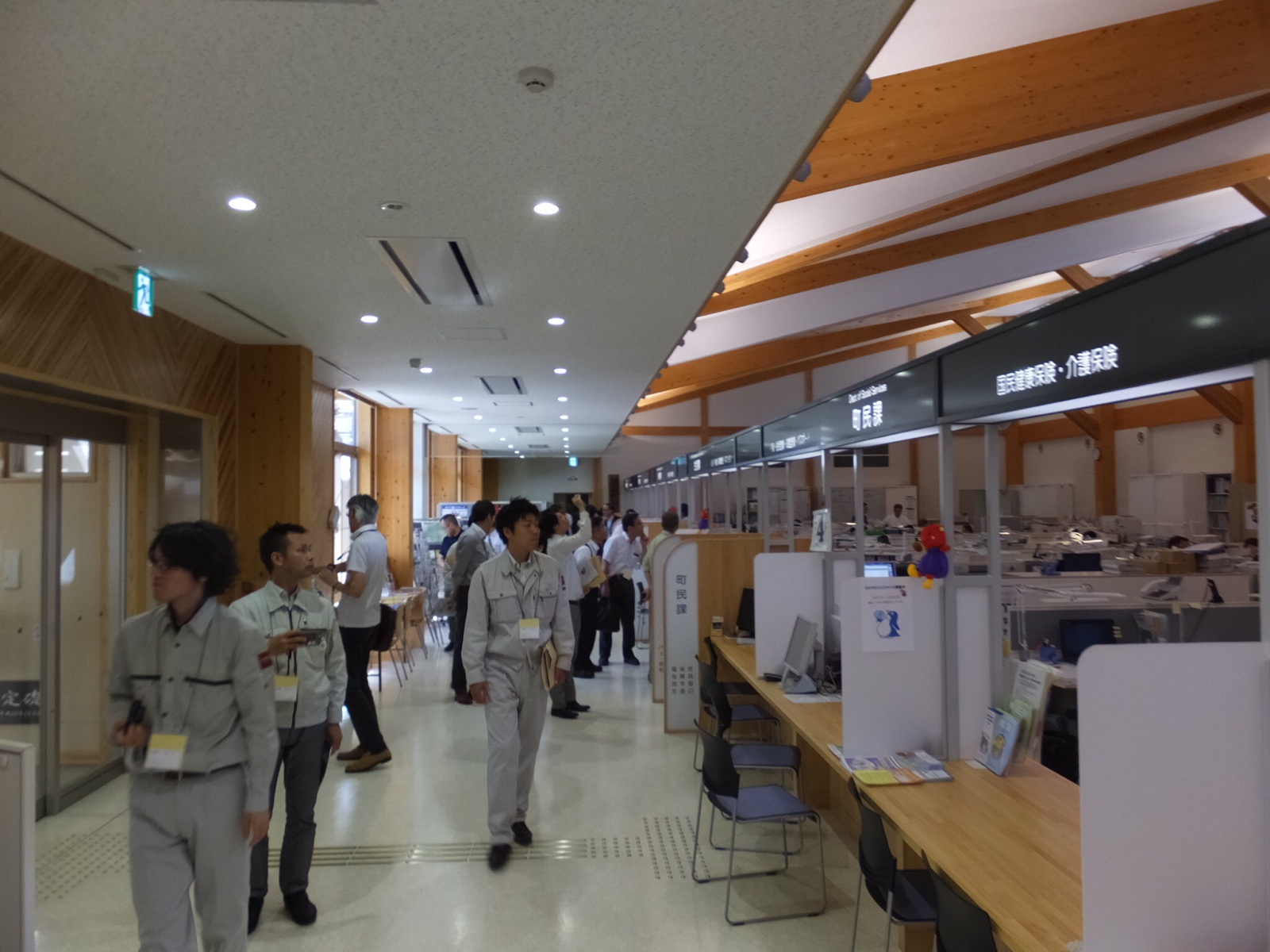 竣工供用開始してから1年半の物件と施工中物件、役場庁舎と共同住宅等 なかなか一緒に見学できる機会が少ないこともあり、自治体及び業界関係者の方が多数来訪され、参加者からは多くの質疑応答が聞かれる等熱気あふれる見学会となりました。