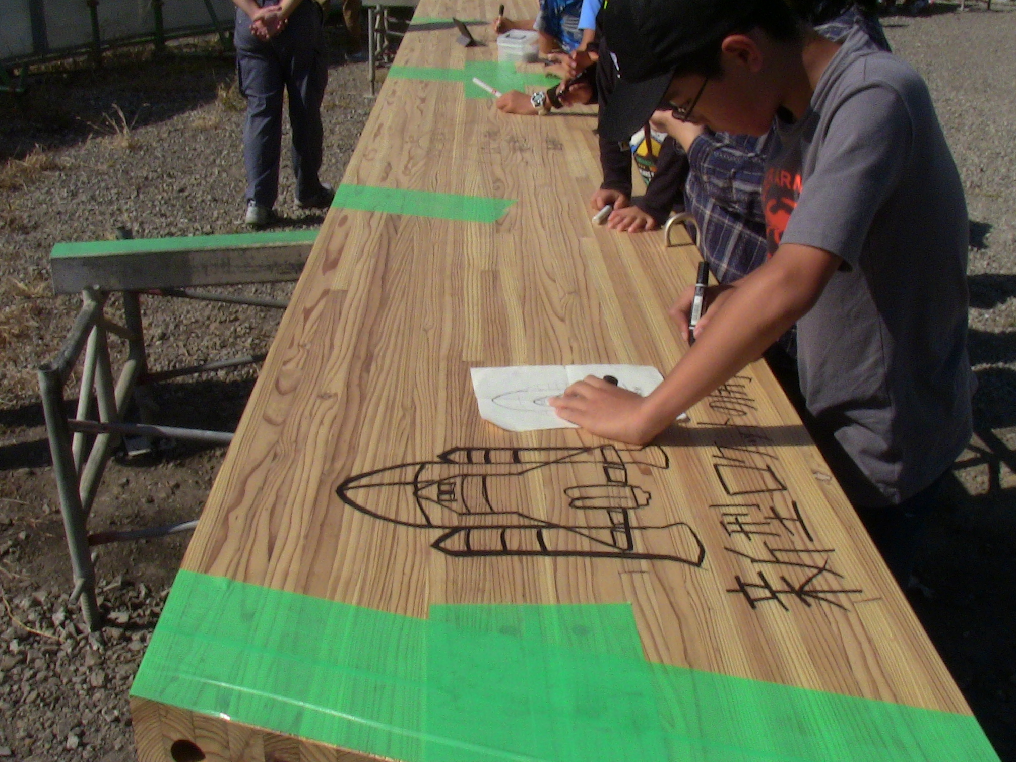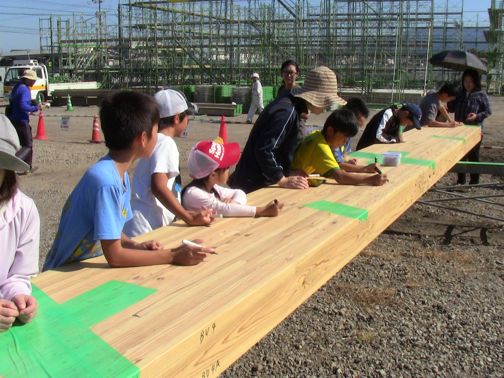 当日は晴天のなか約40名の御家族が参加し、梁材に寄せ書きを行いました。