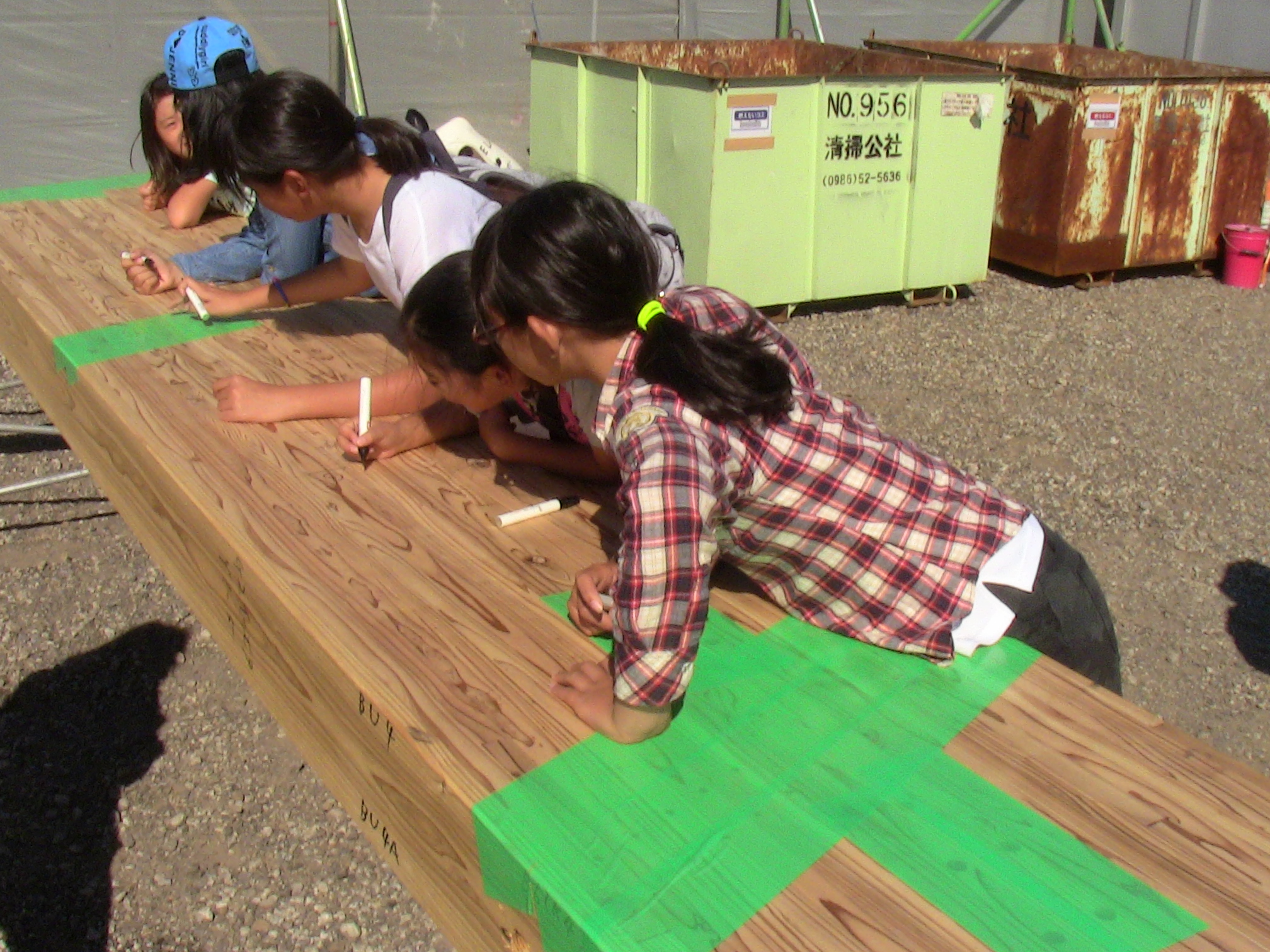 最初は戸惑いながら小さい文字で書いていましたが、リラックスすると梁材をキャンバスに大きな文字で将来の夢(スポーツ選手なりたい・ロケット開発者なりたい・大工なりたいなど)や絵を書いていました。