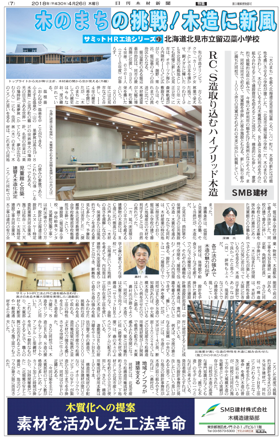 「日刊木材新聞」(2018/4/26発行)に 「北見市立留辺蘂小学校」が掲載されました