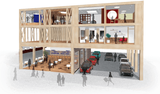 木質二方向ラーメン構造を実現した工法。従来の木造建築の制約から解放された自由度の高い設計を可能にします。